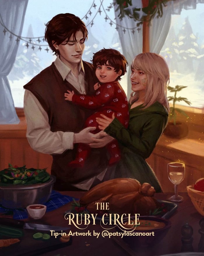 @patsylascanoart: Epilogue — Adrian preparing Christmas dinner, holding Declan, as Sydney returns from her museum internship.