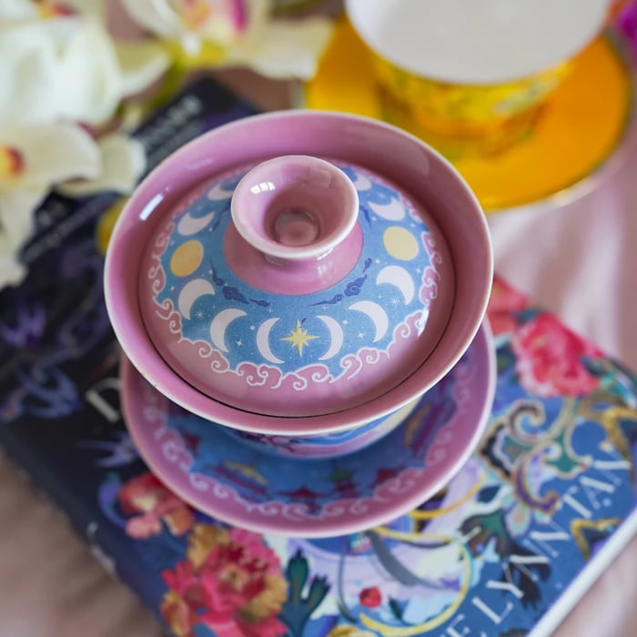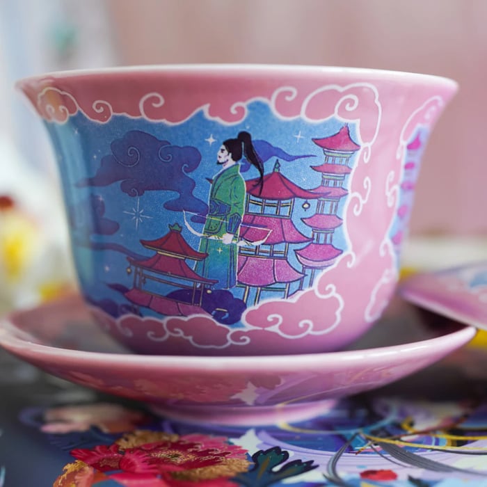 A traditional-style ceramic cup, lid, and saucer featuring scenes from the legend of Chang’e.